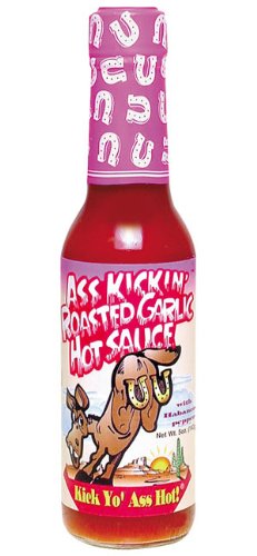 The Ass Kickin' Roasted Garlic Hot Sauce. "A first date nightmare, roasted garlic combined with Habanero and Jalapeno peppers to provide a flavorful sauce bursting with bulbus pleasure." This listing is for one 5 ounce bottle of Ass Kickin' Roasted Garlic Hot Sauce