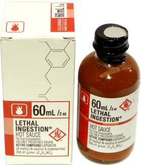 Lethal Ingestion Hot Sauce (1.7 FL.OZ. / 50ml): Lethal Ingestion is truly worthy of it's name! Red Savina, Fatalii, and Bhut Jolokia chiles are blended together using our special process to create the World's Hottest Non-Extract Hot Sauce! Rx: Use only 1 small drop per large food item. Contains no oleoresin of capsicum.